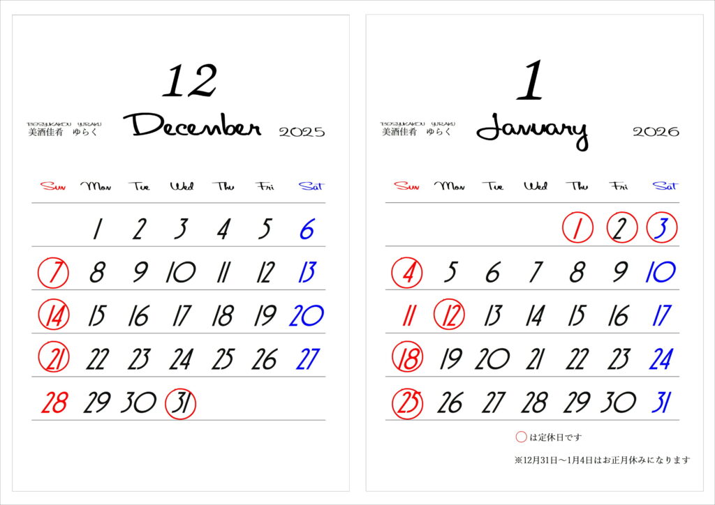 2025年12月、2026年1月営業日のご案内をさせていただきます。