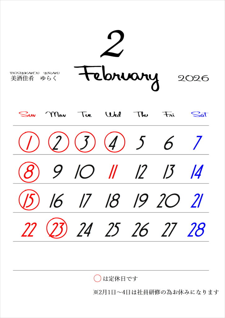 ※2月1日(日)〜4日(水)は社員研修のため、誠に勝手ながら店休日とさせていただきます。